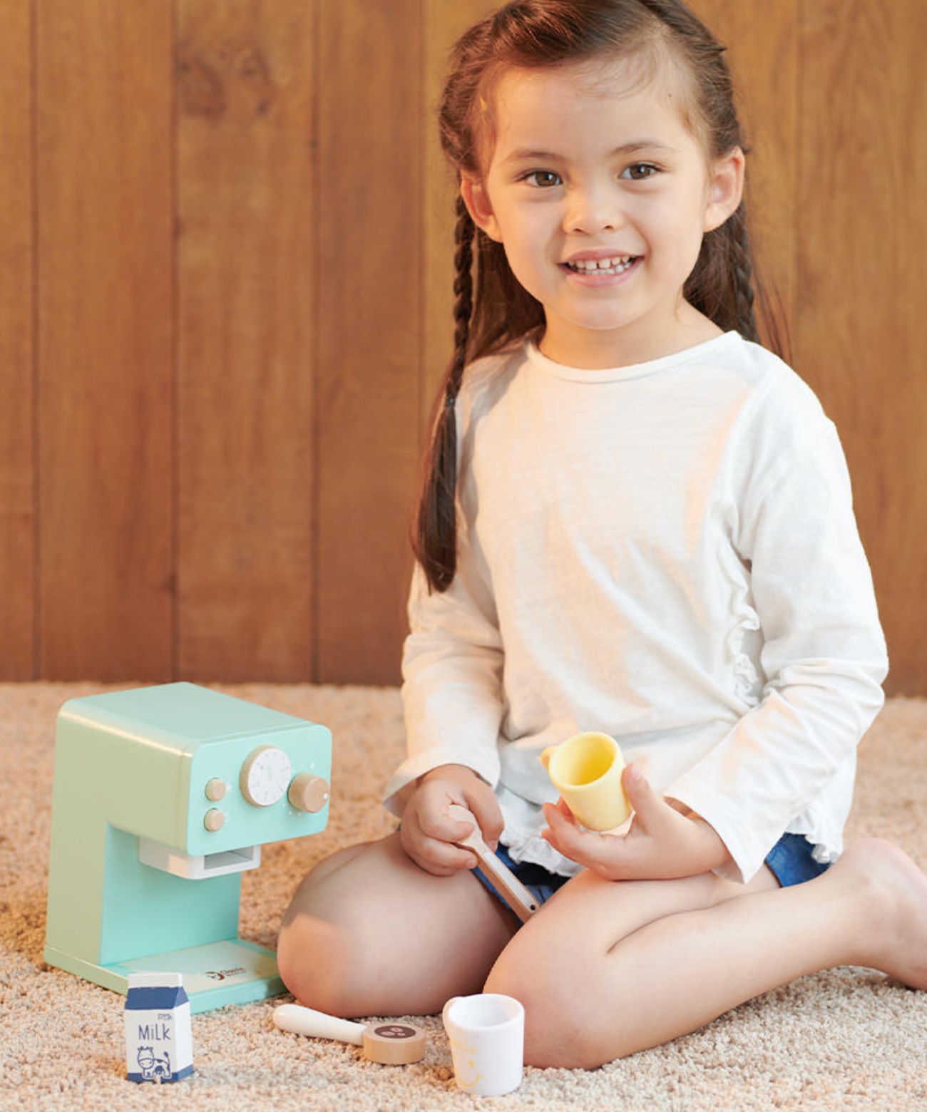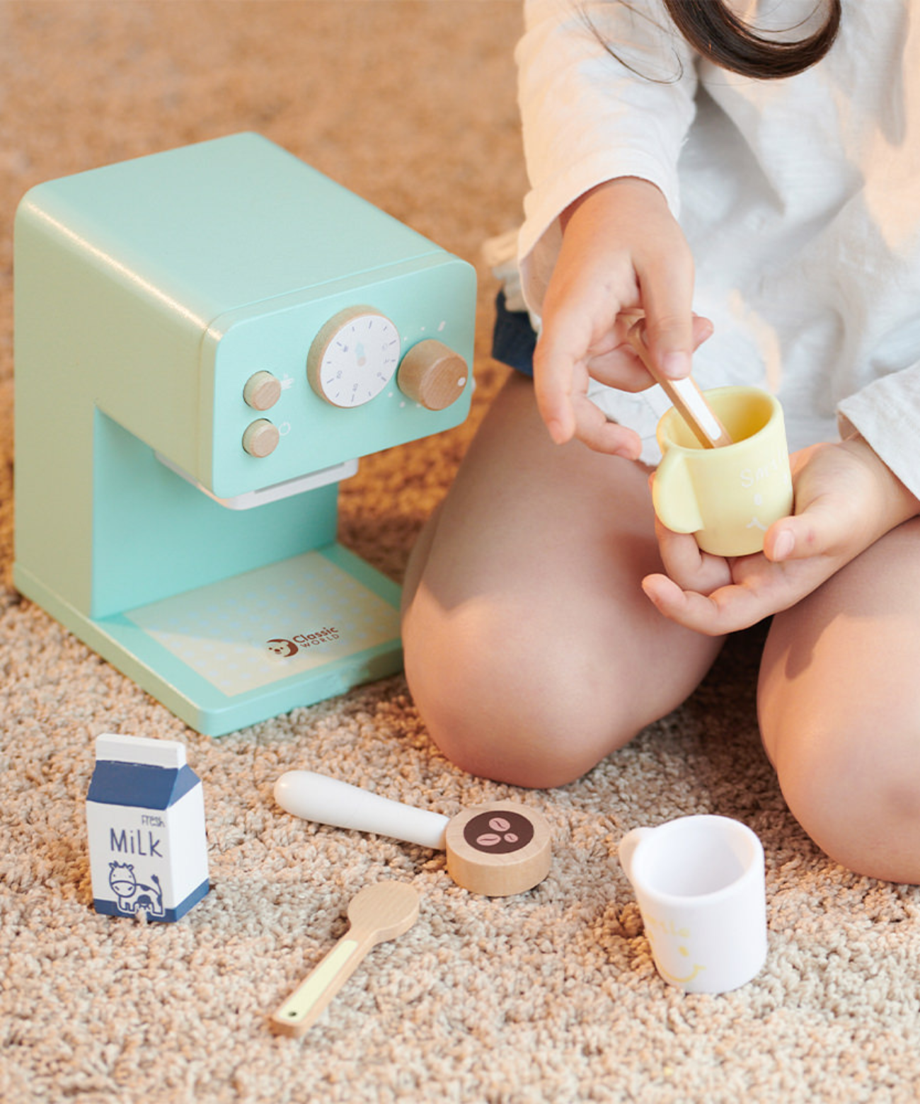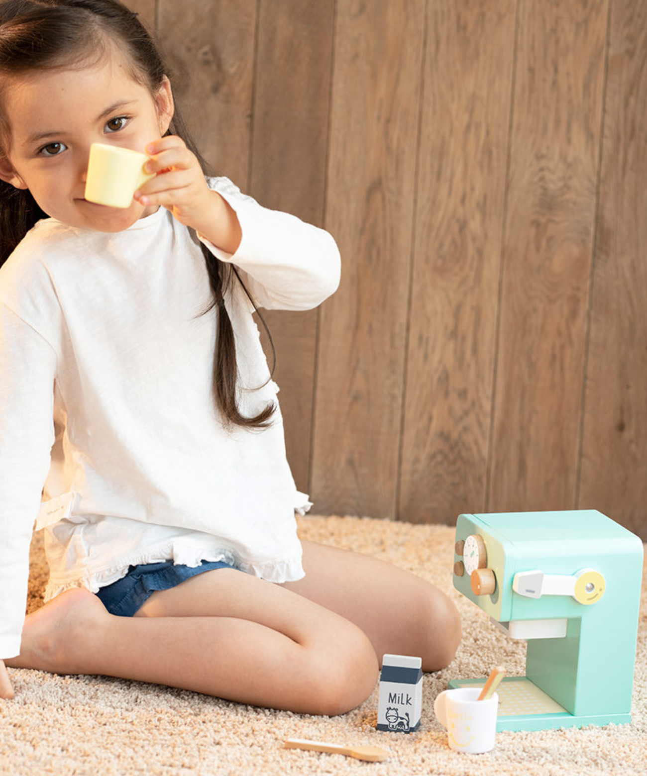 Brew up hours of imaginative fun with this beautifully designed wooden coffee machine. Complete with two mugs, spoons, a coffee filter, and a milk carton, it offers everything little baristas need for a realistic coffee-making experience.