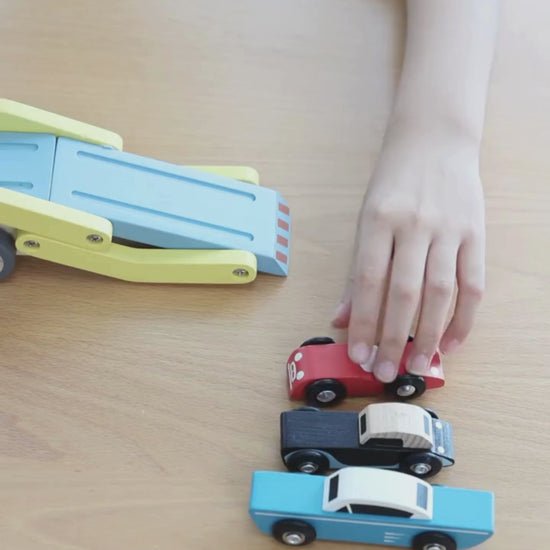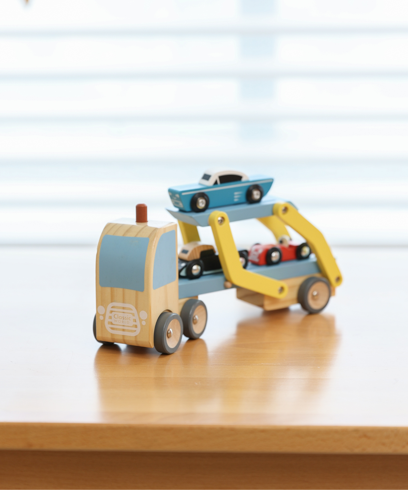 This wooden car transporter toy set imitates the process of a carrier truck loading and unloading cars. When lowering the level, the second deck functions as a ramp for cars to climb onto the truck; when lifting the level, it becomes a complete double-decker system. Children can simulate scenes of cars climbing upon the deck as well as the trailer lifts the cars and delivers them.