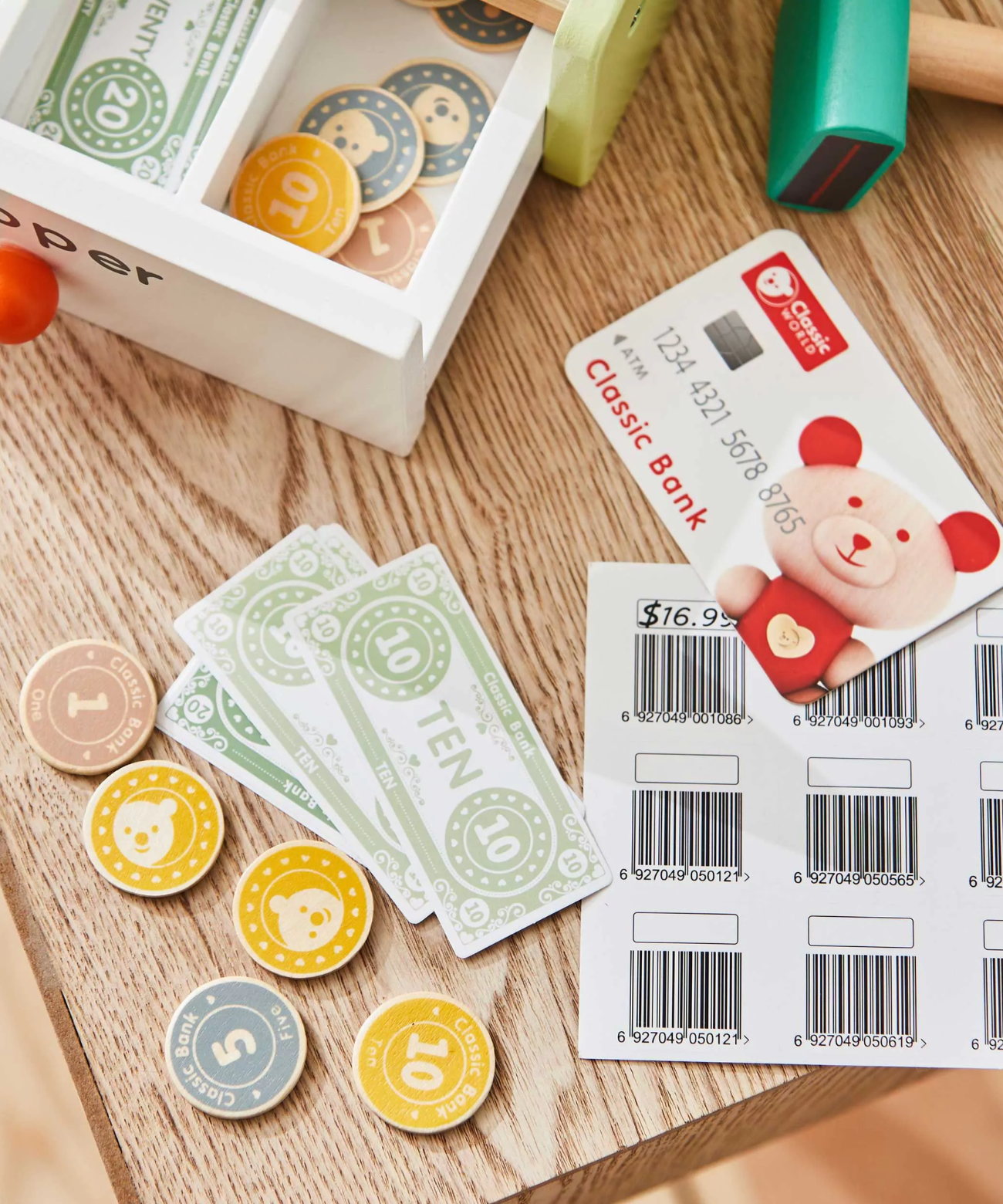 The included bank card, coins, and notes teach children about money and how transactions work, helping them develop an understanding of purchasing and basic computing skills. A wonderful educational toy for toddlers to build early financial literacy and practice problem-solving in an engaging way!