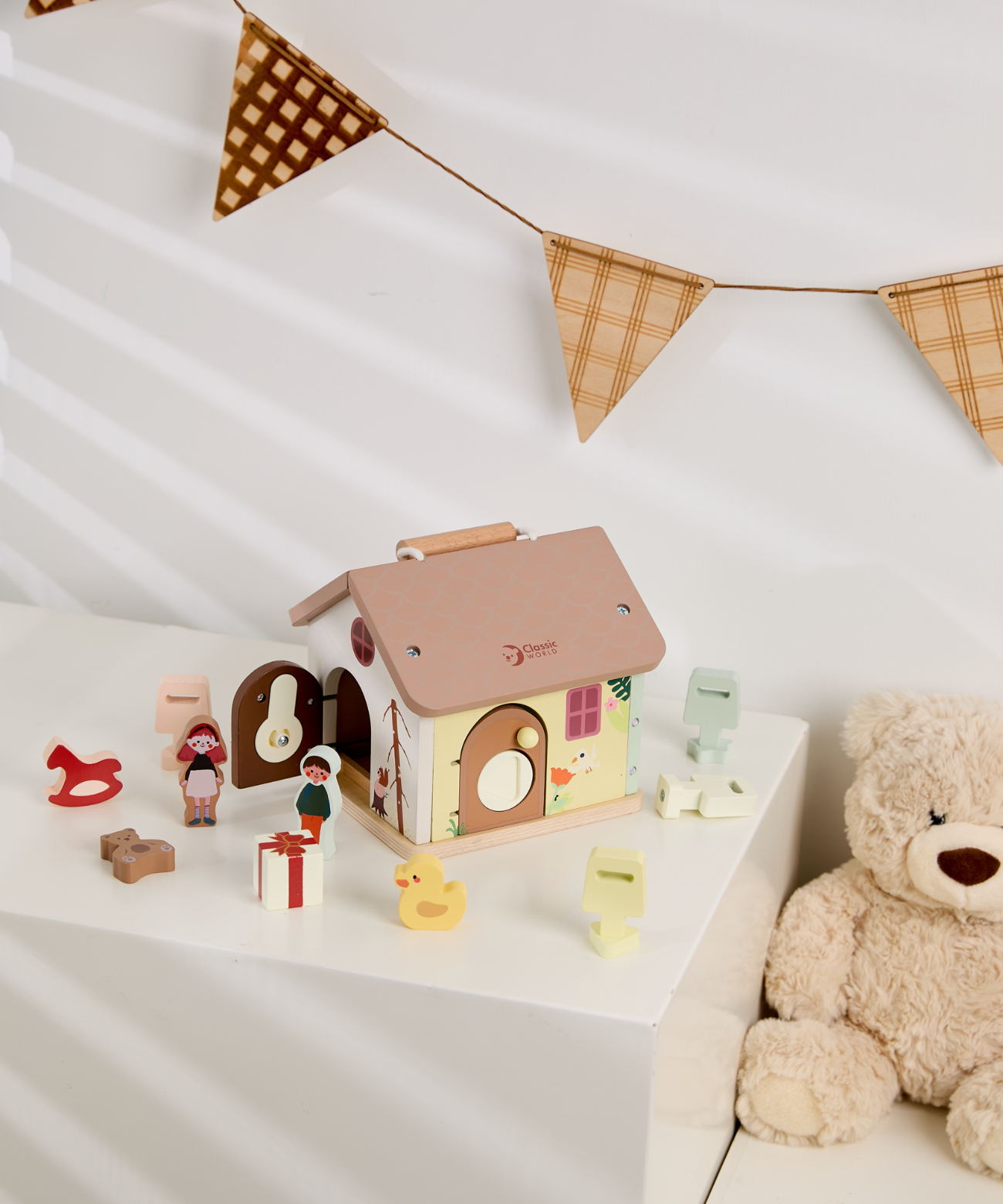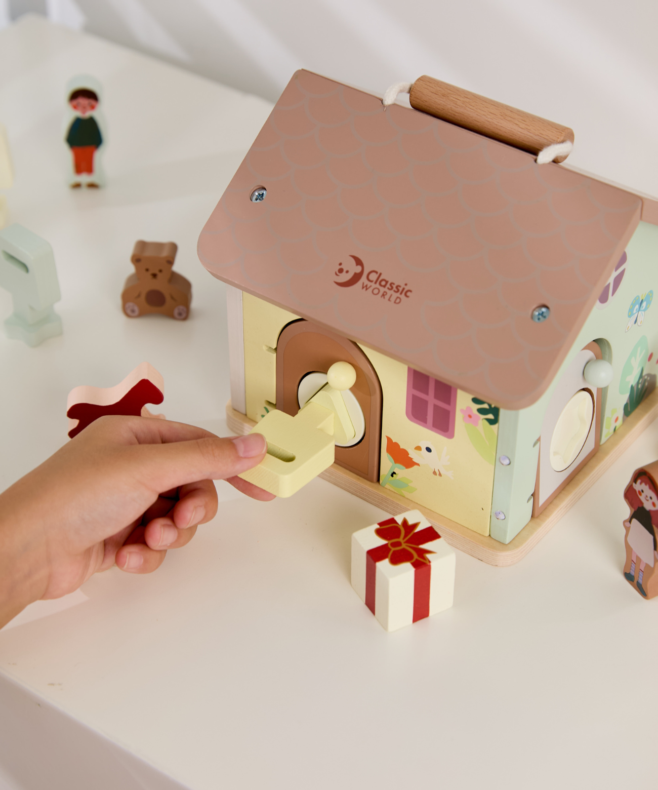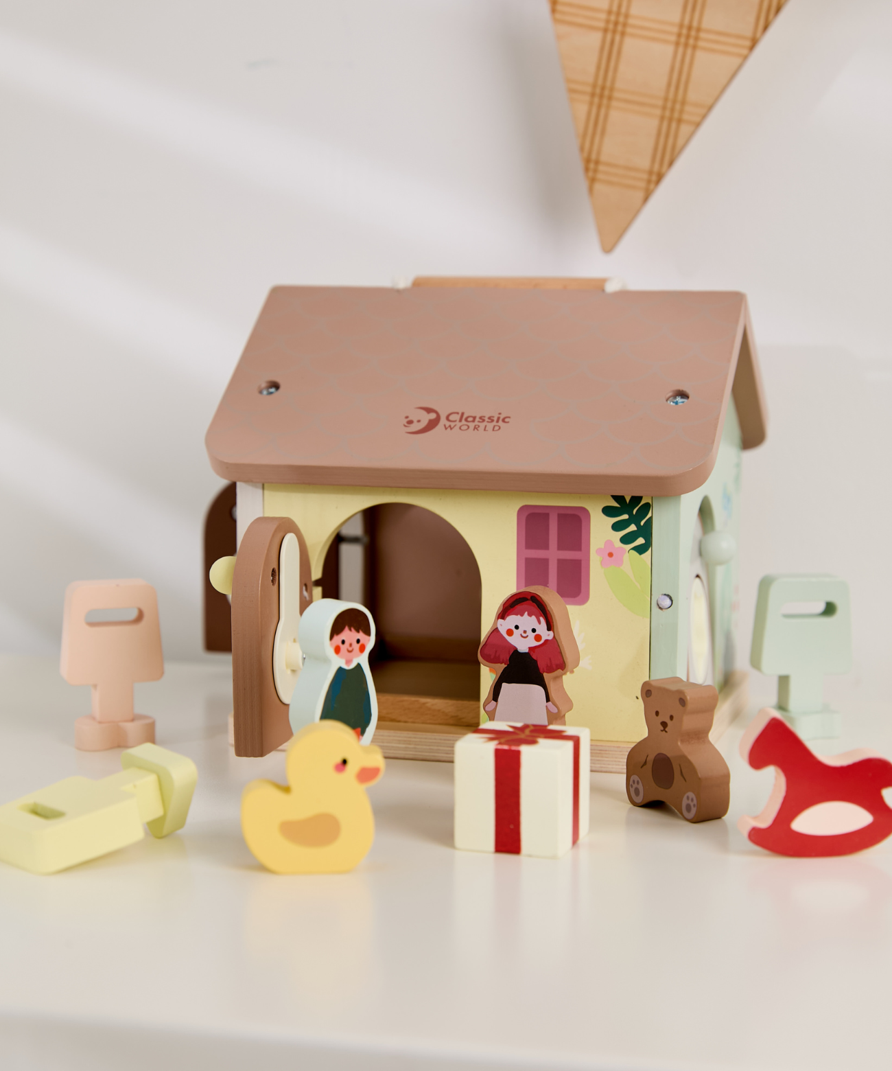 The Wooden Locking House is a fun and engaging wooden toy designed to help little ones practice fine motor skills and hand-eye coordination. Children can insert the key through different colourful shapes and experience the joy of unlocking the door.