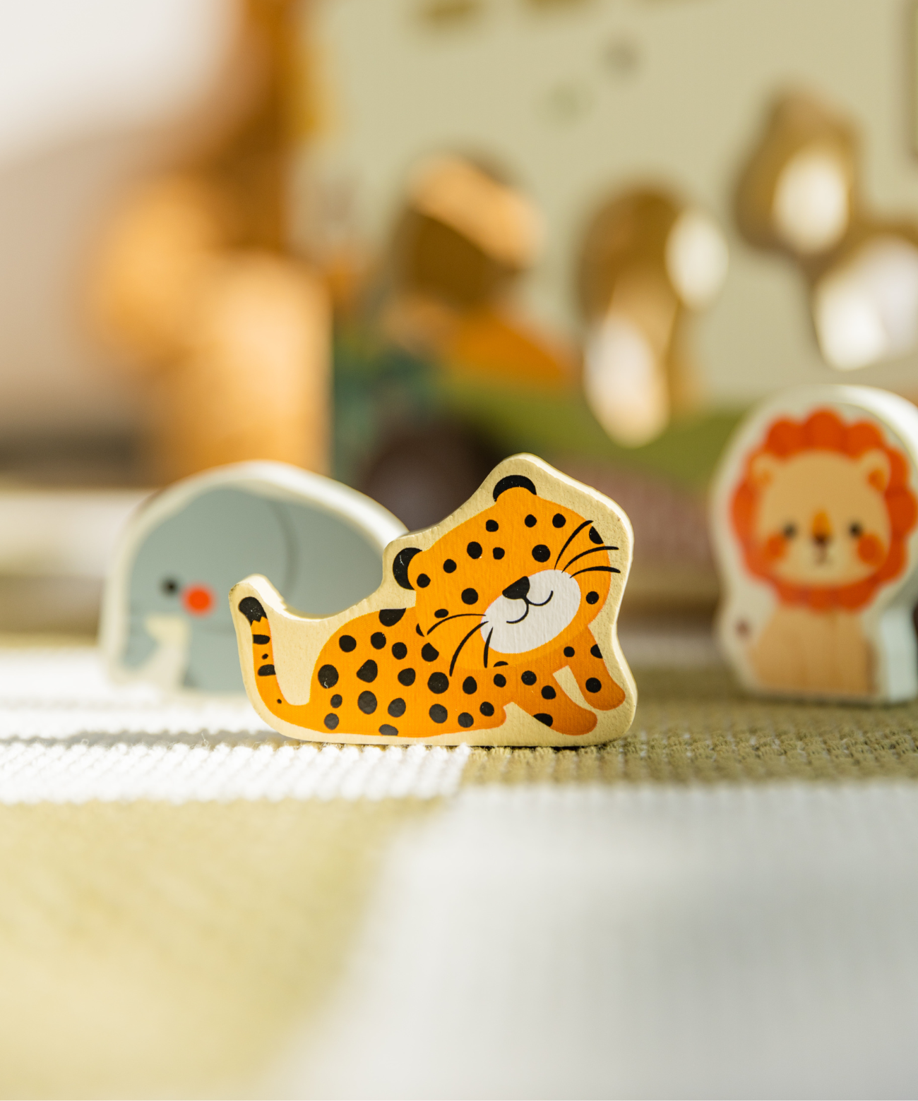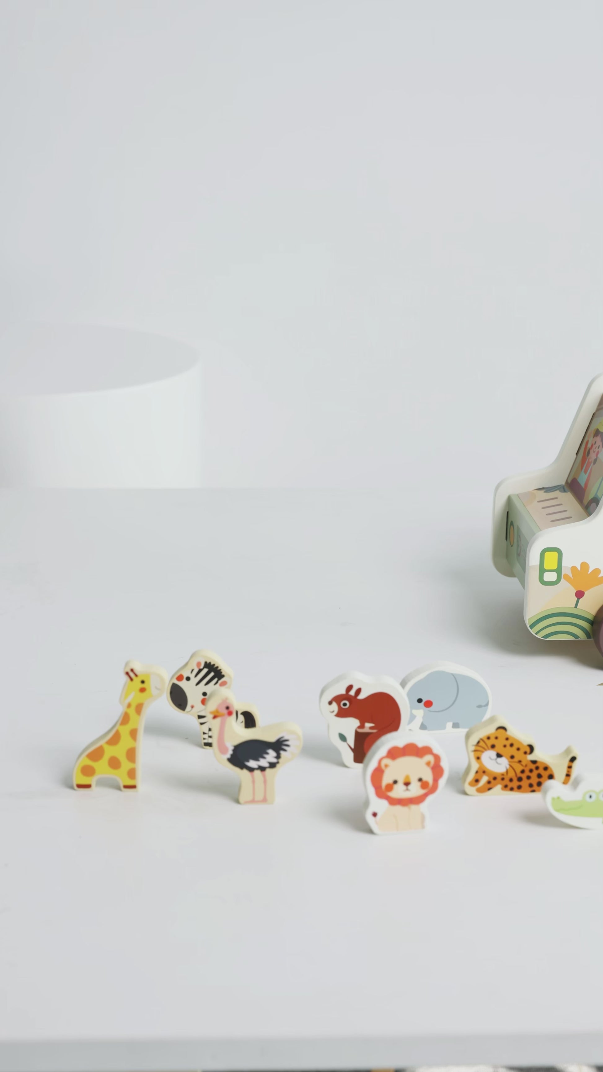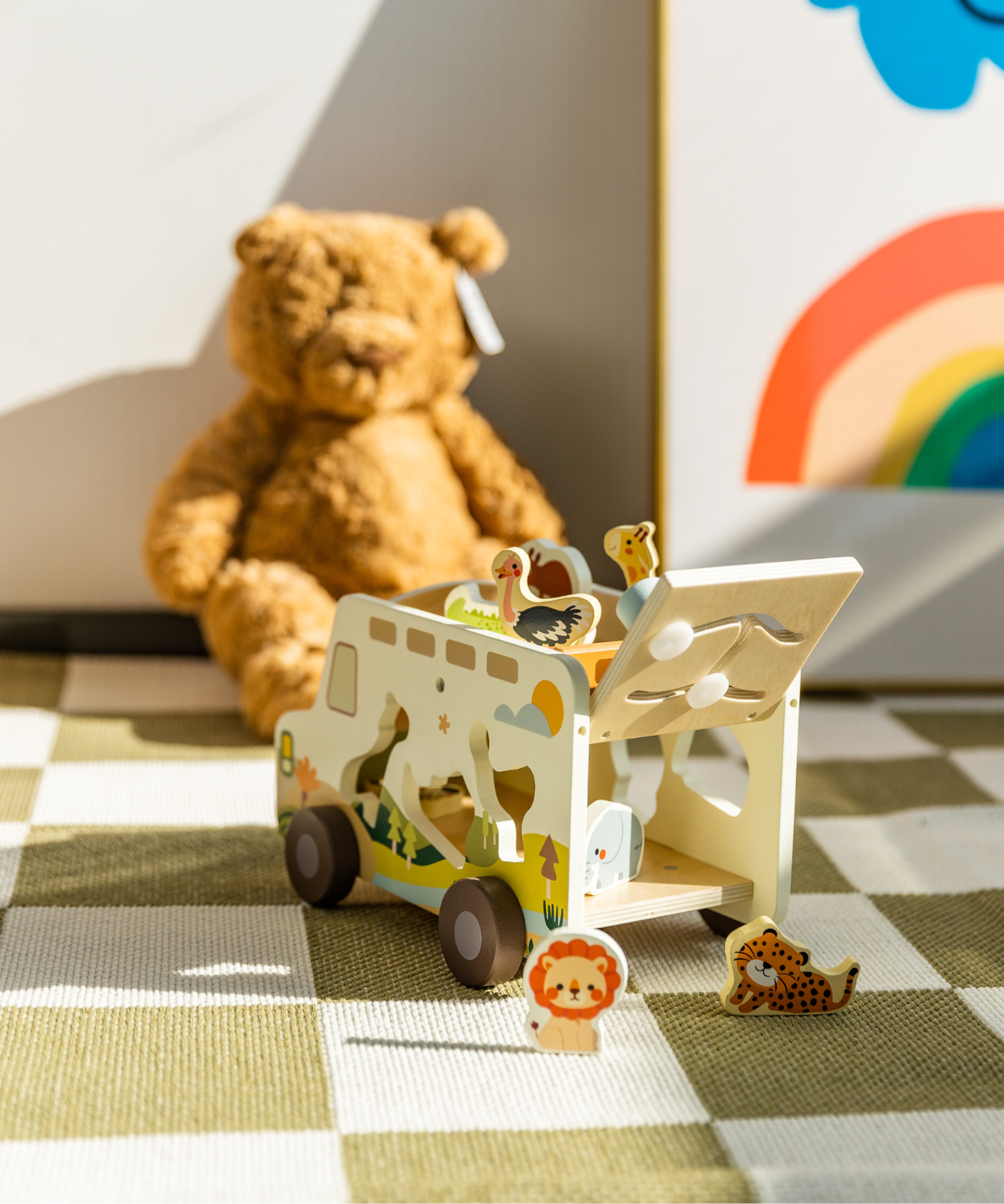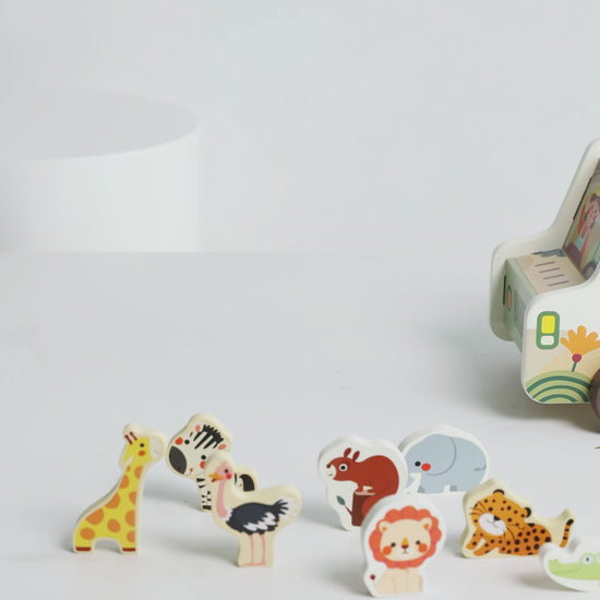 Ready to zoom across the savanna with your animal friends? This Wooden Prairie Adventurer Truck with moveable wheels consists of eight different animals, fitting perfectly into the sides through die-cut slots.
