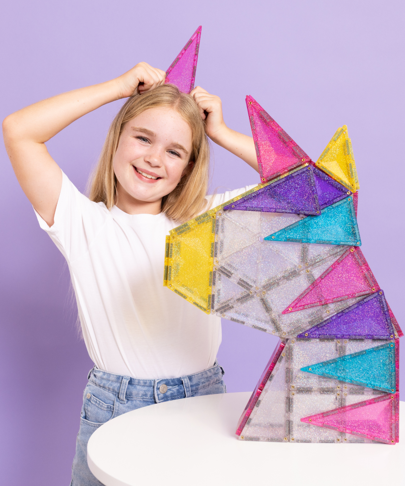 Designed for the unicorn lovers, fantasy dreamers and creative explorers, this pack is filled with delightful play possibilities. Featuring a stunning combination of glitter magnetic tiles in dazzling clear and vibrant bright colours of pink, yellow, teal and purple, plus a thoughtful selection of shapes in squares, hexagons, rectangles, triangles and trapezoids to bring your sparkly unicorn creation to life!