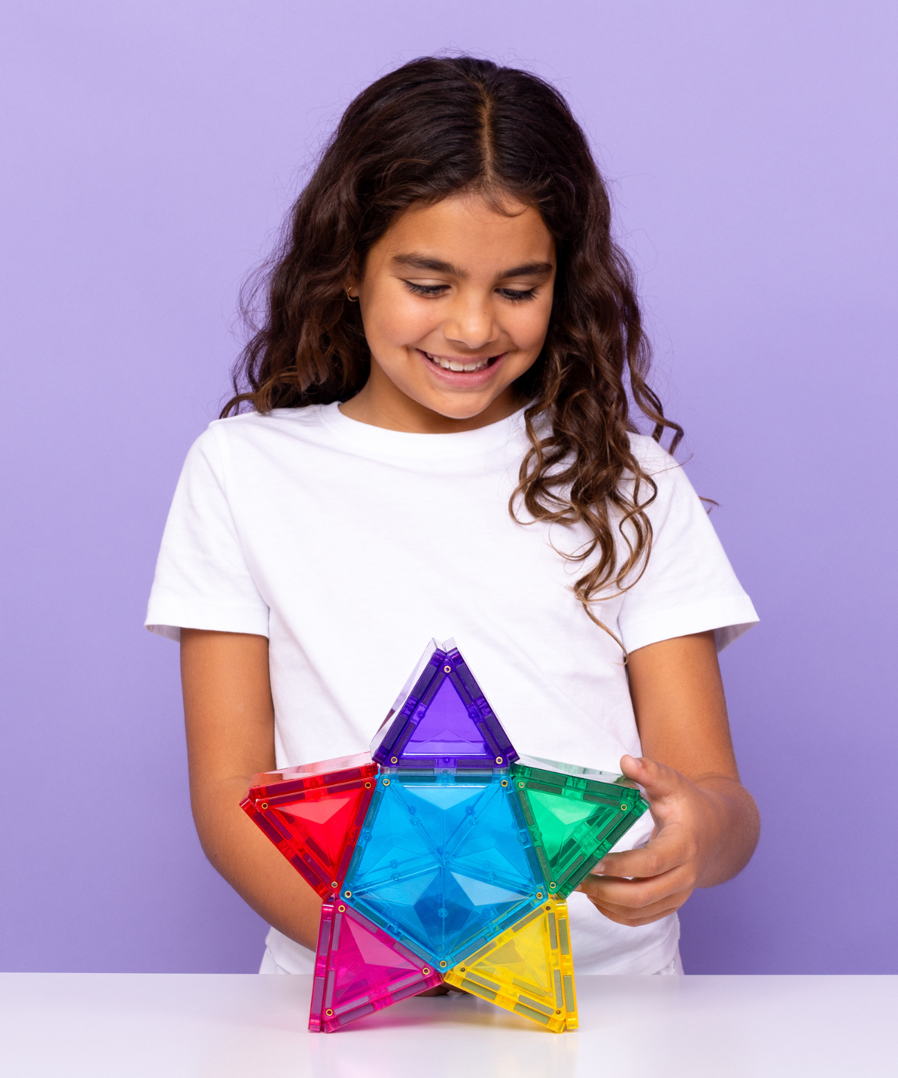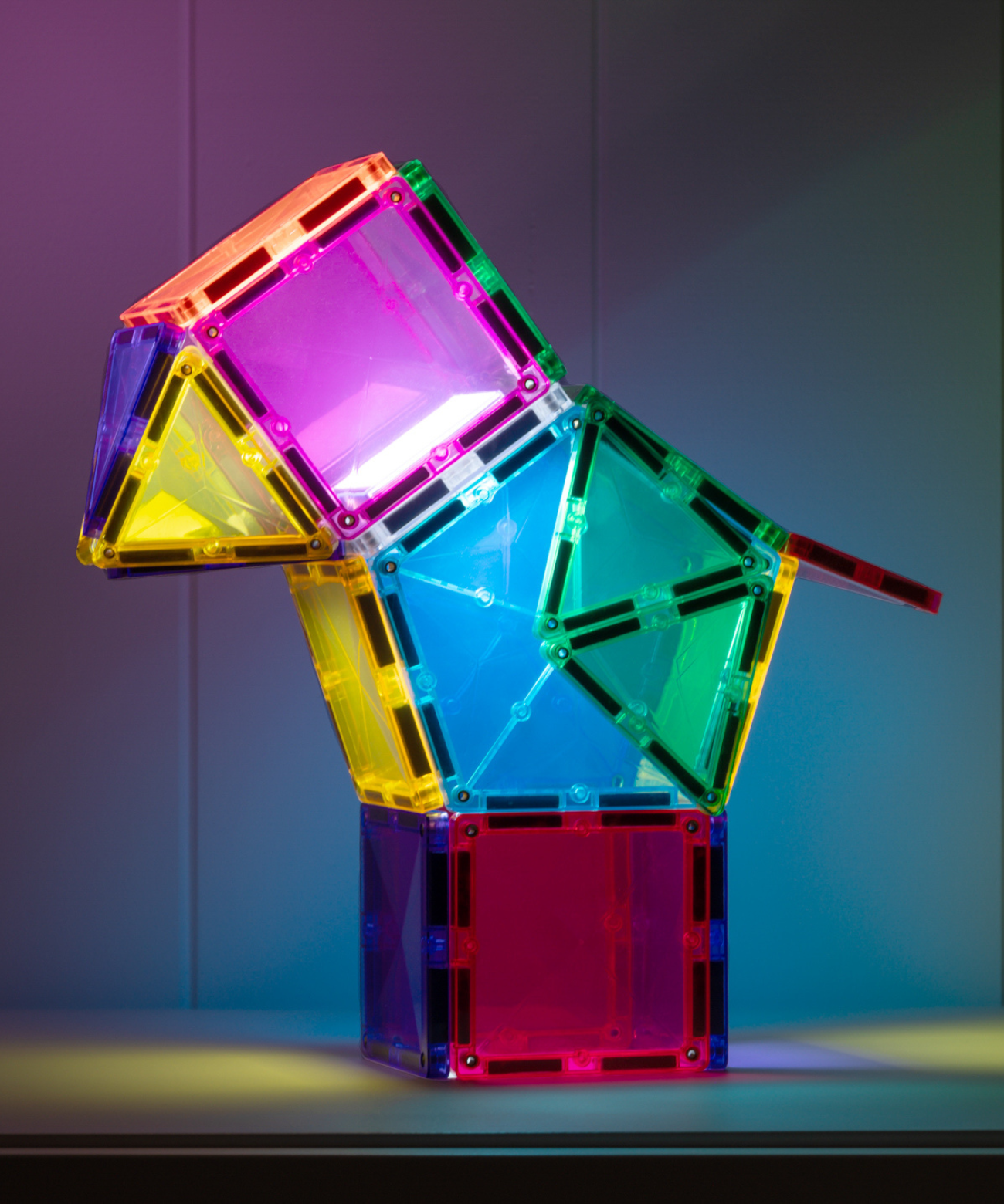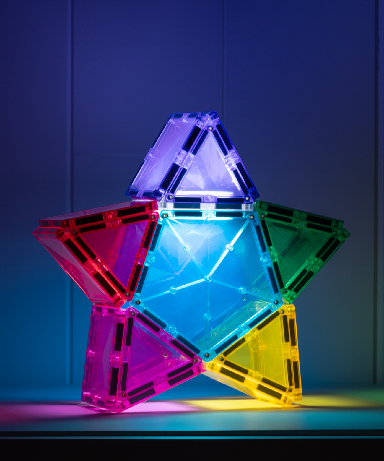 Discover the magic of open-ended STEAM play as you take colour and light exploration to a whole new level. Featuring pentagons, squares and equilateral triangles in all eight bright colours – plus a rechargeable light-up magnetic tile, this pack is designed to transform construction play into a wonder-filled lightshow!