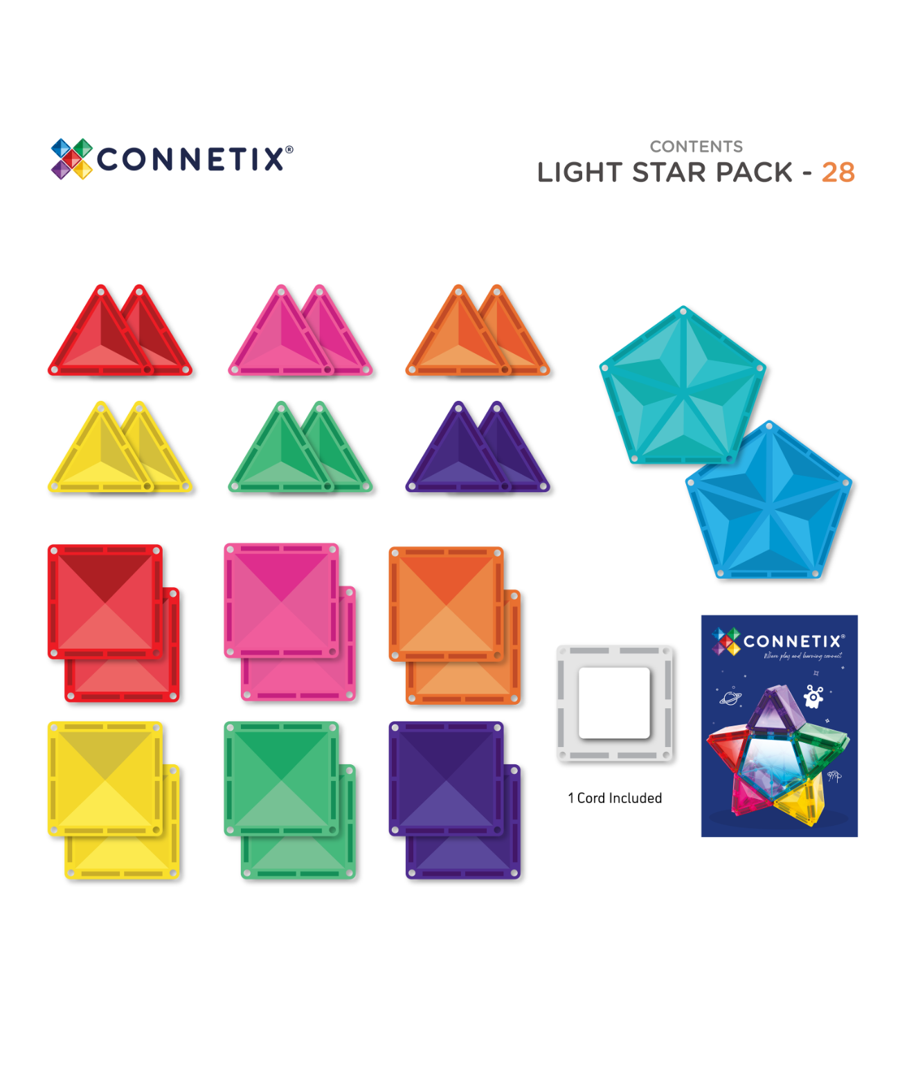 At the touch of the button, you can brighten your play from every angle. Simply light up one side of the tile to see the magic shine through or create something entirely different by lighting up both sides and watch your design burst to life! Featuring the CONNETIX unique bevel design, children can experiment with the intensity and direction of light to explore fun STEAM learning concepts from colour mixing to refractions, shadows and optical illusions. You can expand the collection and complement your Light Star Pack with CONNETIX classics — the 102 Piece Rainbow Creative Pack or the 202 Piece Pastel Mega Pack!